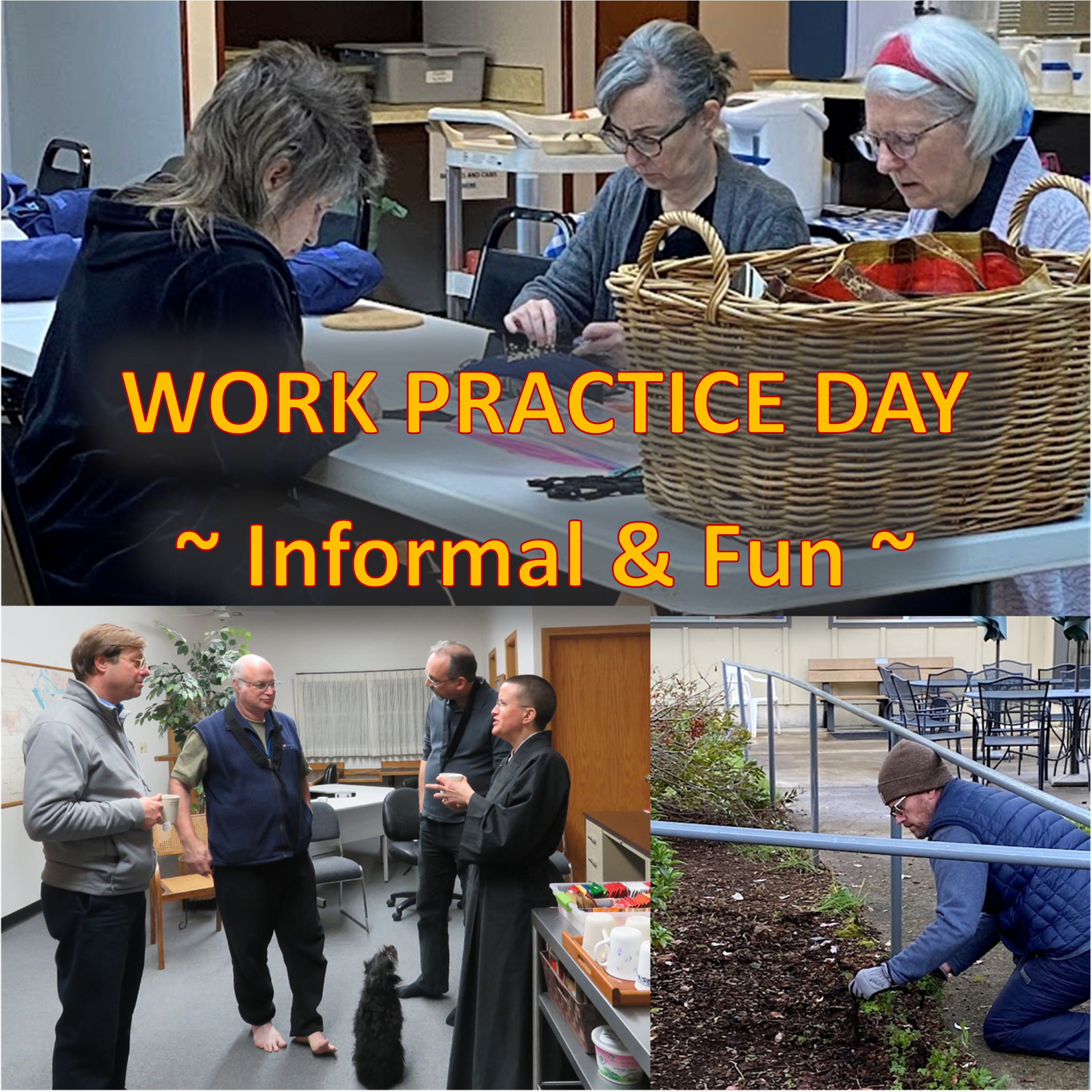 Come spend time with Sangha members! Join us in the Dirt Zendo for an informal work practice day, or if you aren’t local and have BWZ-related stuff to do you might want to join us on Zoom # (1010). At noon we’ll order pizza for anyone who wants lunch. Click here for more info!